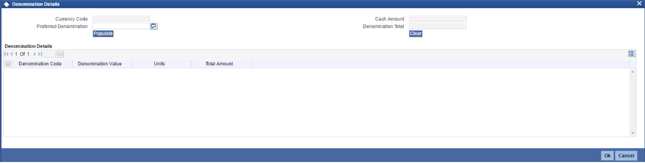 You can specify denomination details in ‘Denomination Details’ screen by clicking ‘Denomination’ button in ‘Murabaha - Payment by Cash’ screen.