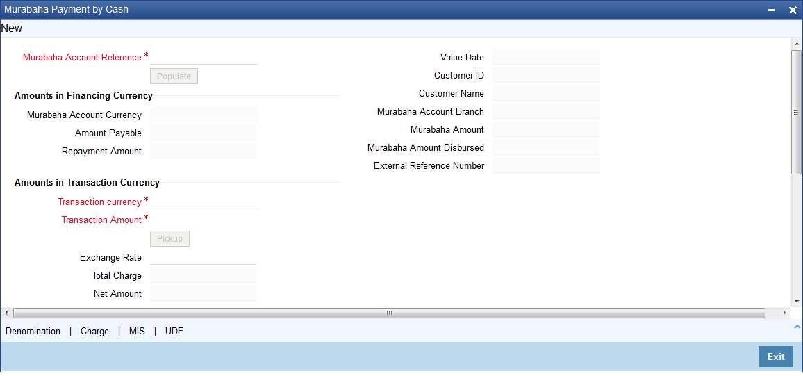 Click ‘Populate’ button to fetch the details for Murabaha account for which the Cash Payment is being done.