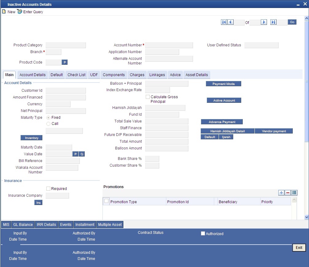 During Finance processing, it is required to capture finance details and not initiate till verification of documents, etc. This module creates a finance account in an inactive state. Inactive finances are input by a separate screen similar to the Accounts screen or by Uploads. After manual verification the account is entered as an inactive account. The account is activated once the requisite documents are received. You can invoke ‘Inactive Accounts’ screen by typing ‘CIDINADT’ in the field at the top right corner of the Application tool bar and clicking the adjoining arrow button.