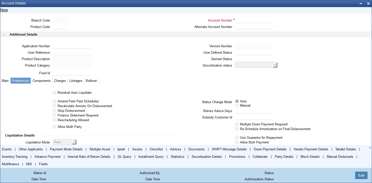 Inactive finances are activated by clicking on Activate Account button or through an upload. Upon finance activation, Limits Utilizations are updated. Accounting entries are passed for disbursement and for any upfront changes as defined in the product.