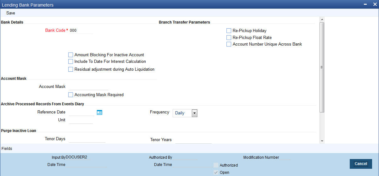 Inactive finances can be deleted even after the authorisation of Inactive finance account. In Bank Parameters, Site specific parameters are provided to control the automatic deletion of Inactive finances. An Inactive Finance processing supports this deletion.