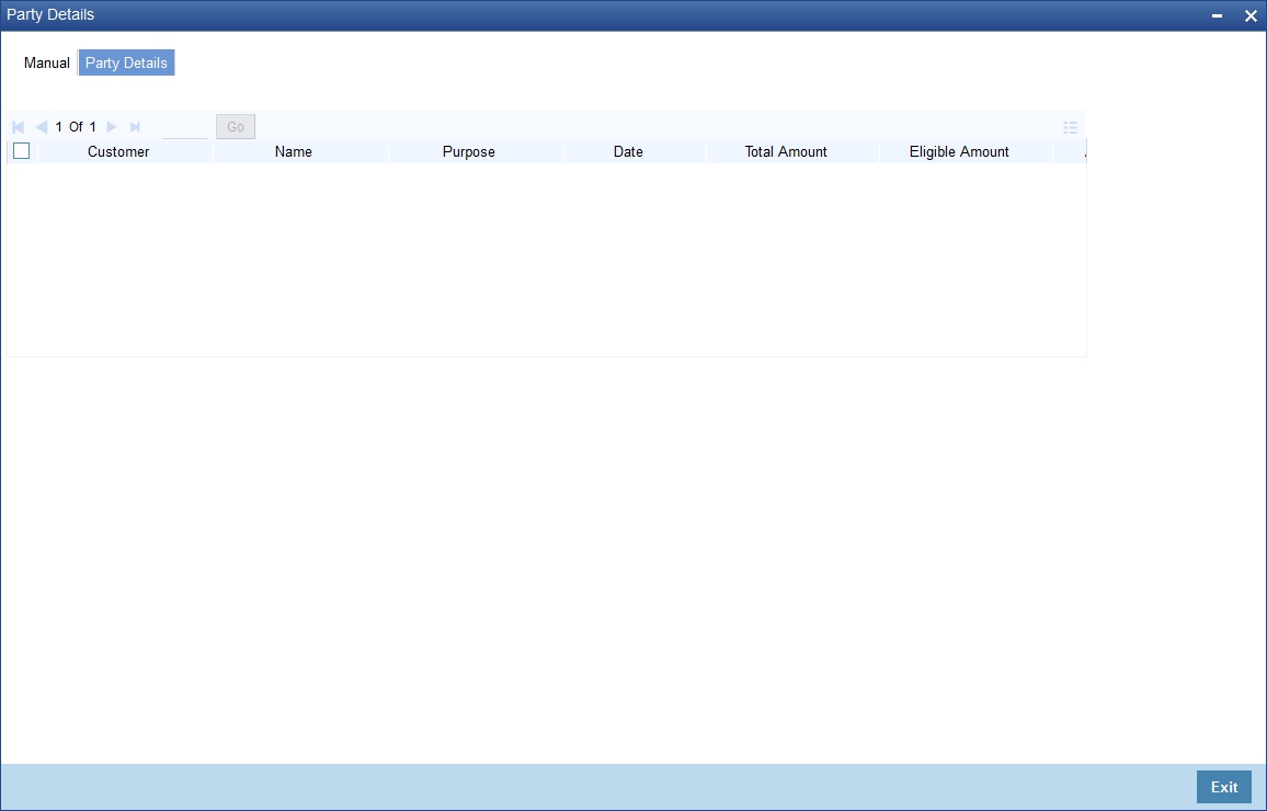 Click on the ‘Party Details’ button to view manual disbursements already done for the contractor. In this screen the system displays the progressive cash outflows that have been done so far and the details of each manual disbursement done by the Bank.