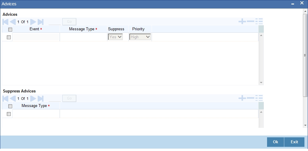 You can view the advices defaulted which also includes the Payment Message in the ‘Advices’ screen. To invoke this screen, click ‘Advices’ button on the ‘Manual Disbursement’ screen. You can also choose to suppress the messages as required.