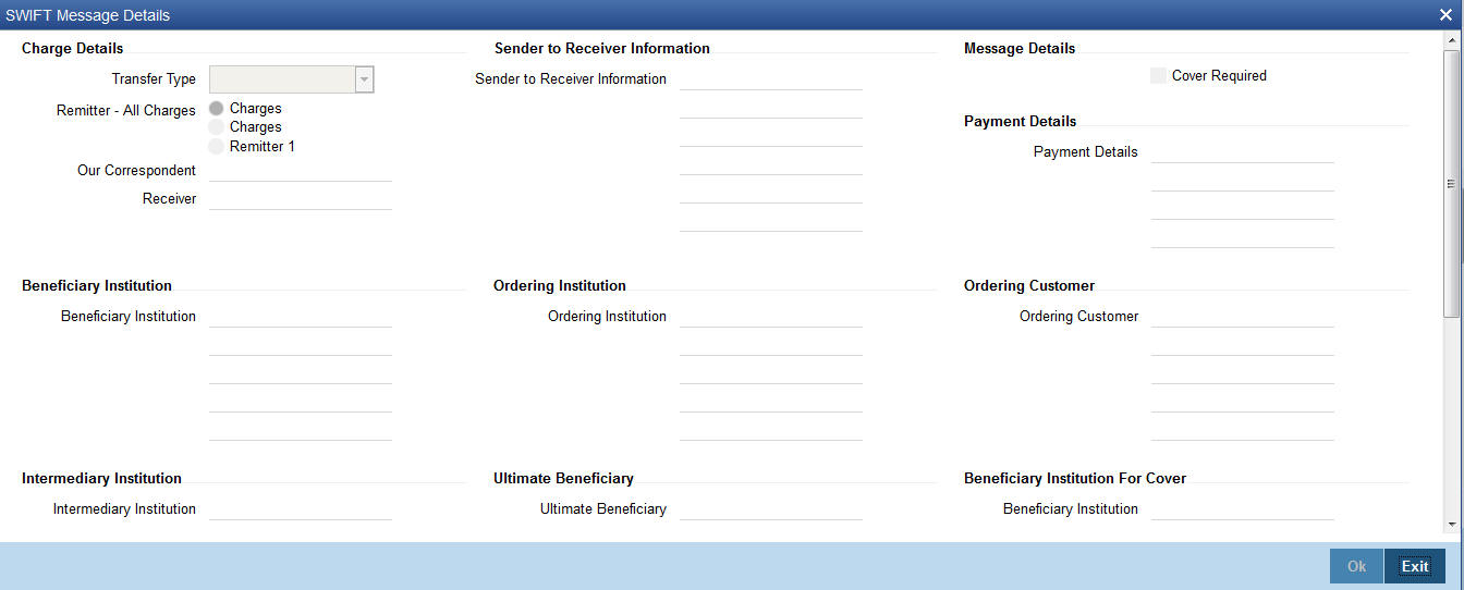 Specify the ordering institution details. Alternatively, you can select the ordering institution details from the option list. The list displays all valid ordering institution details maintained in the system.