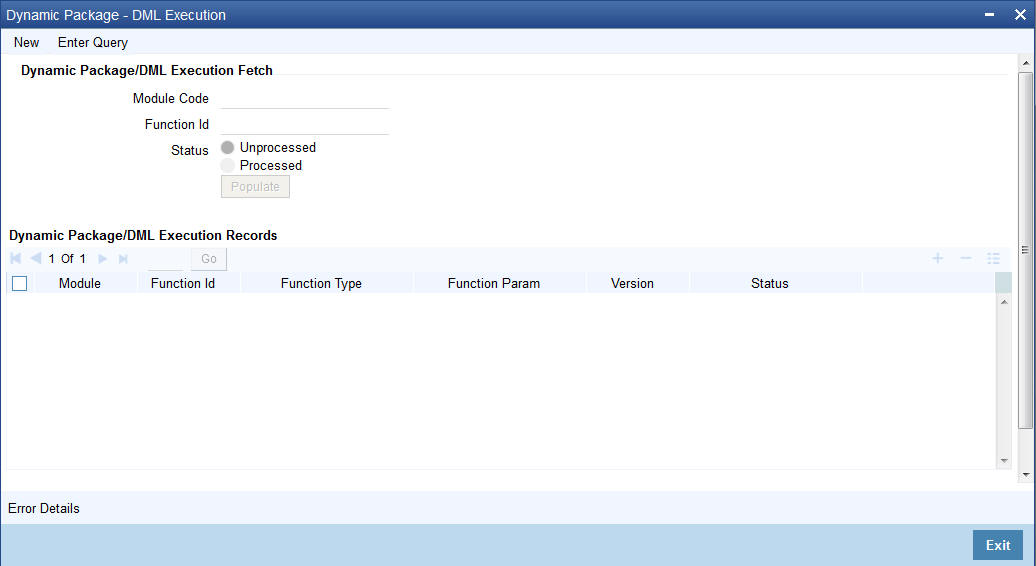 On selecting the status as 'Unprocessed' and upon clicking the 'Populate' button, you can view the list of records which are yet to be compiled in the PDB. These records can be processed on clicking the button 'Process All Records'. The system displays an information message once processing of all the records are completed. You cannot do any other operation after processing the records. The action buttons will be disabled.