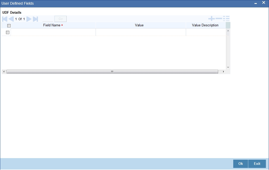 You can maintain the AUDF (ASCII User Define Function) details in the ‘AUDF Maintenance’ screen. You can invoke this screen by typing ‘GIDAUDFM’ in the field at the top right corner of the Application tool bar and clicking the adjoining arrow button.