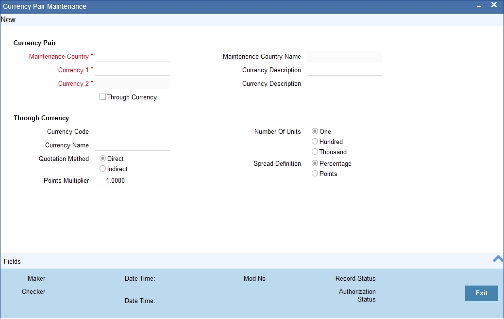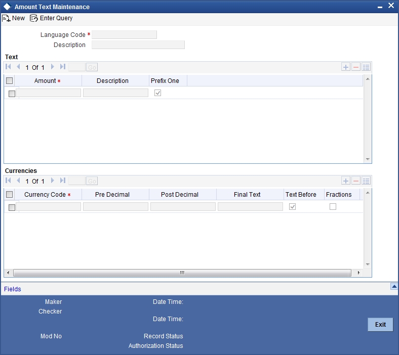 Amount translation details can be maintained as one time maintenance at the time Oracle FLEXCUBE is installed at your bank. Once maintained, the amount descriptions printed on account statements, and other messages, will be described according to your specifications in this screen.