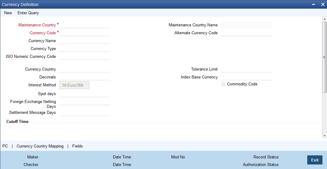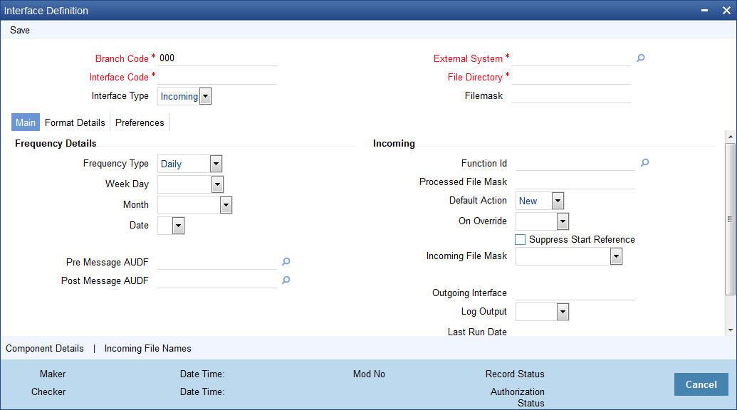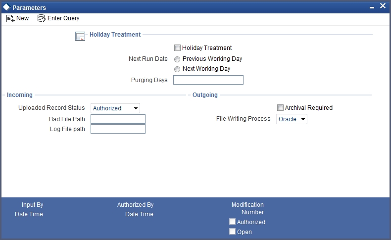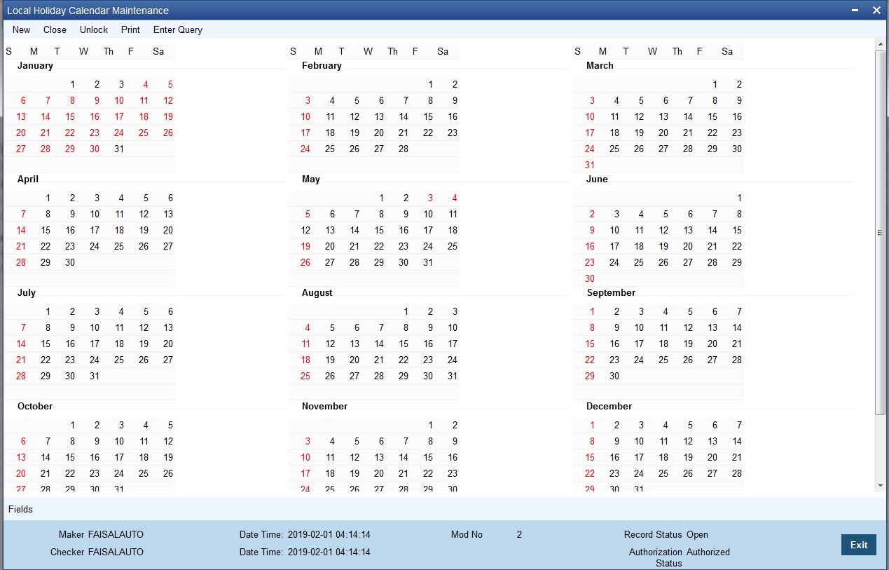 This screen is maintained for each branch, of your bank, from the respective branches; thus making it possible to have a different set of holidays for different branches of the bank.
