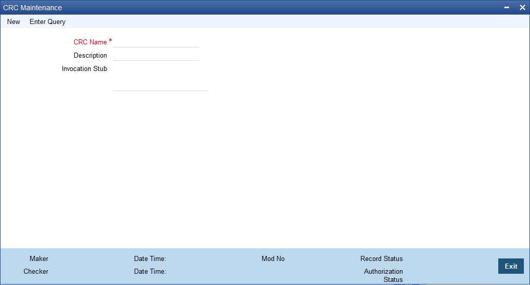 You can view the CRC details maintained in the system using ‘CRC Summary’ screen. You can invoke this screen by typing ‘GIDCRCFN’ in the field at the top right corner of the Application tool bar and clicking the adjoining arrow button.
