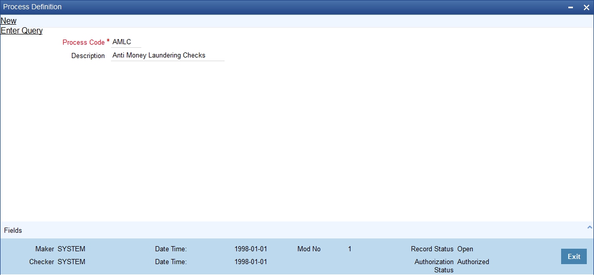 You can maintain the process codes using the ‘Process Definition’ screen. You can invoke this screen by typing ‘SMDPRCDE’ in the field at the top right corner of the Application tool bar and clicking on the adjoining arrow button.