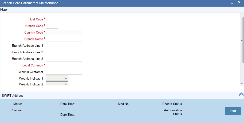 You can invoke ‘Branch Core Parameter Maintenance’ screen by typing ‘STDCRBRN’ in the field at the top right corner of the Application tool bar and clicking on the adjoining arrow button.