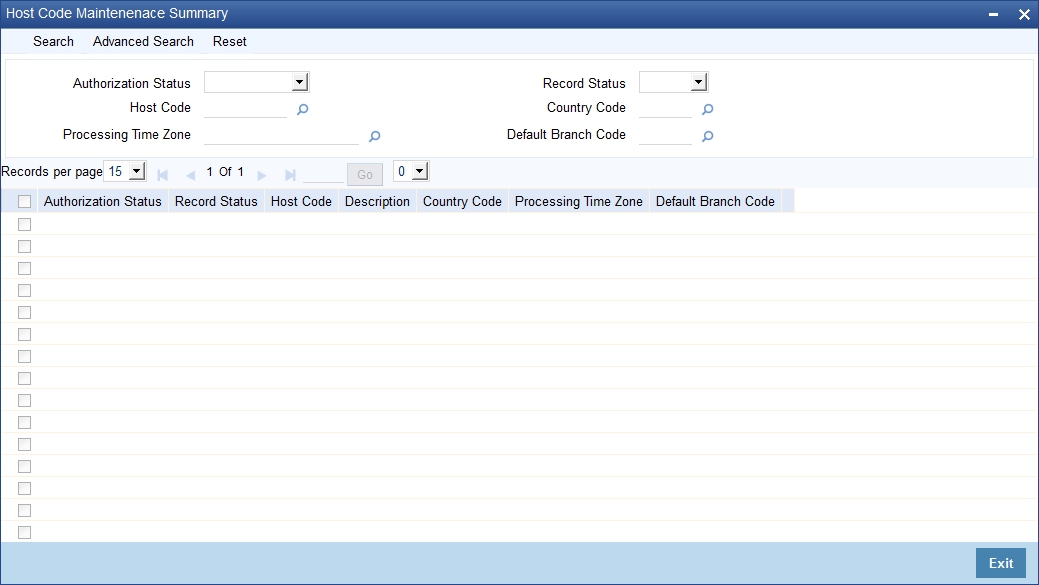 You can invoke ‘Host Code Maintenance Summary’ screen by typing ‘STSHSTCD’ in the field at the top right corner of the Application tool bar and clicking on the adjoining arrow button.