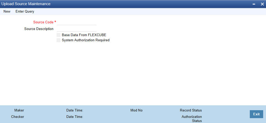 Oracle FLEXCUBE facilitates upload of data from an external source. The details of the source from which data has to be uploaded need to be maintained in Oracle FLEXCUBE using the ‘Upload Source Maintenance’ screen. You can invoke the ‘Upload Source Maintenance’ screen by typing ‘CODSORCE’ in the field at the top right corner of the Application tool bar and clicking the adjoining arrow button.