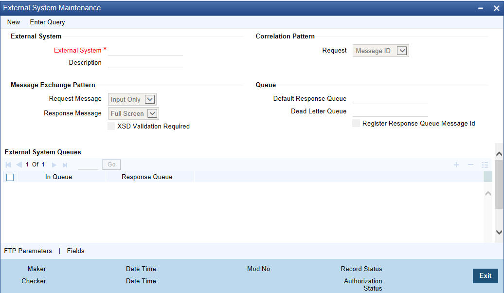 You need to define an external system that will communicate with the Oracle FLEXCUBE Integration Gateway. You can define an external system using the ‘External System – Detailed’ screen.You can invoke this screen by typing ’GWDETSYS’ in the field at the top right corner of the Application tool bar and clicking the adjoining arrow button.