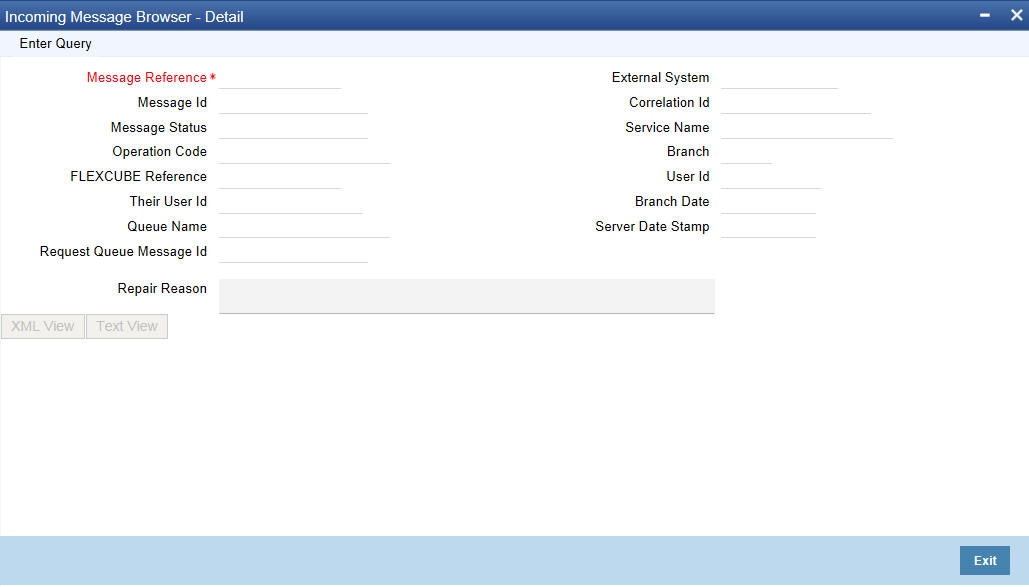 In the ‘Incoming Message Browser’ screen you can view the details of the messages received from the external systems. You can also view the messages in the XML format or the Text format.