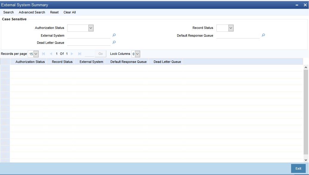 This summary screen can be used to search for external systems which match the data specified for any of the following criteria: