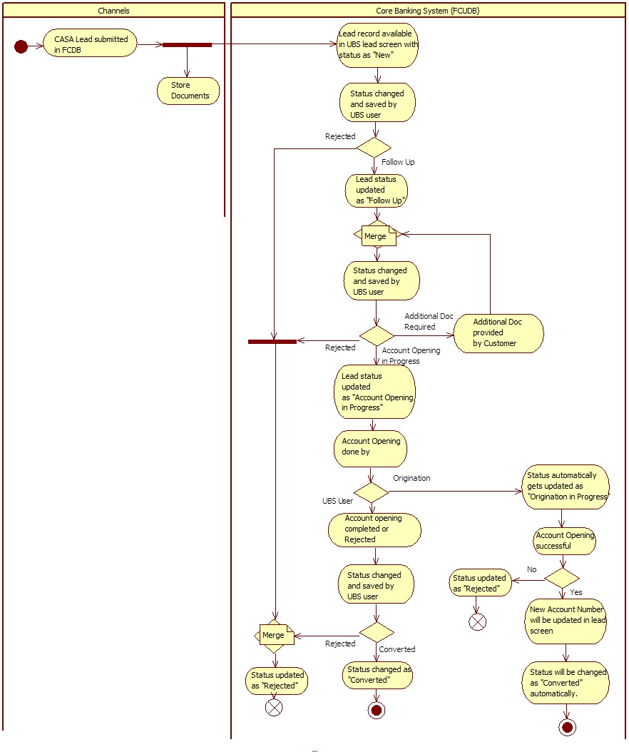 Lead requests from an existing customer are also handled a Lead Maintenance level. However, for a lead record for an existing customer, the requested account is created directly through Customer Account Creation screen or BPMN workflow.