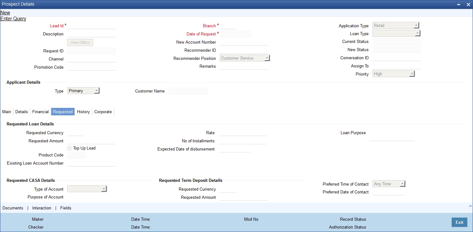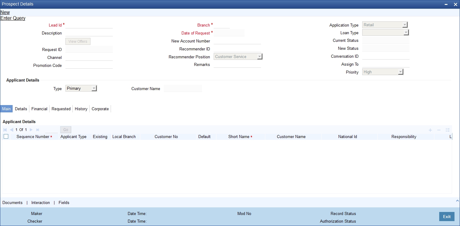 You can maintain the details of a prospective/existing applicant, when the applicant initially approaches the bank to open an account. The system facilitates capturing of lead details through external channels as well.