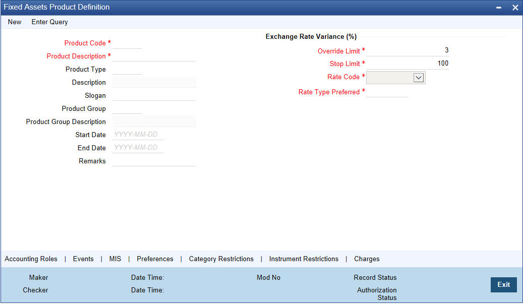 You can associate every FA contract that you maintain in Oracle FLEXCUBE with a Product that you have maintained in this screen.