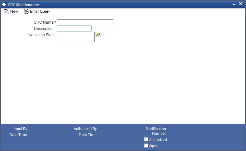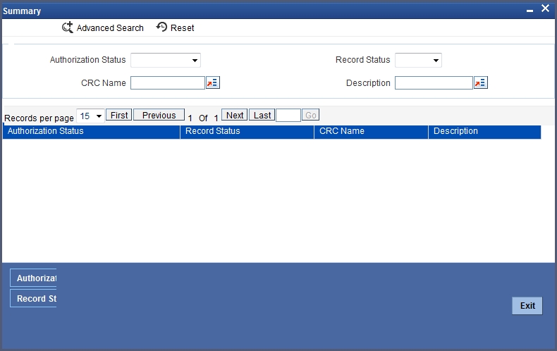 You can view the CRC details maintained in the system using ‘CRC Summary’ screen. You can invoke this screen by typing ‘GISCRCFN’ in the field at the top right corner of the Application tool bar and clicking the adjoining arrow button.