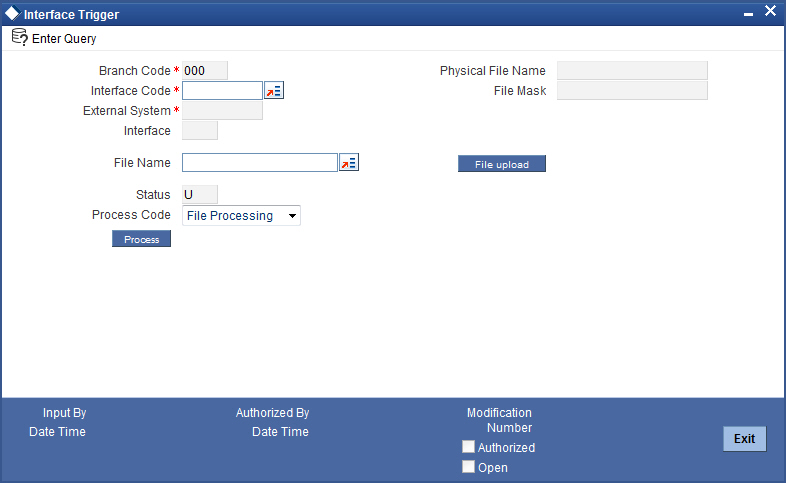 If the upload is successful, the system will display the file name in the filed ‘Physical File Name’ of ‘Interface Trigger’ screen. Click ‘Process’ button to process the file.