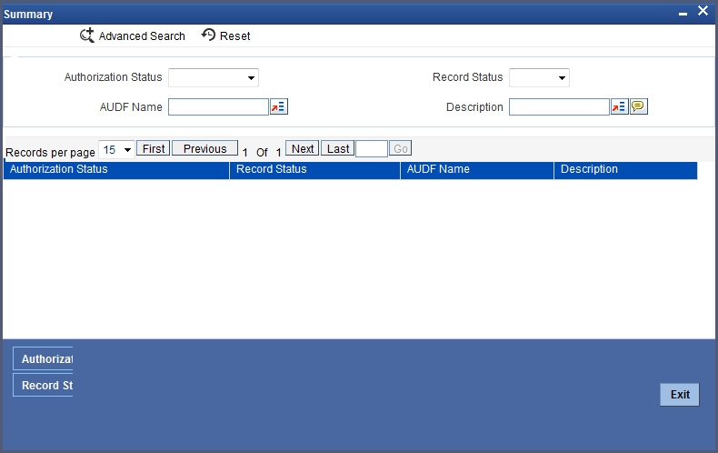 You can view AUDF details maintained in the system using ‘AUDF Summary’ screen. You can invoke this screen by typing ‘GISAUDFM’ in the field at the top right corner of the Application tool bar and clicking the adjoining arrow button.