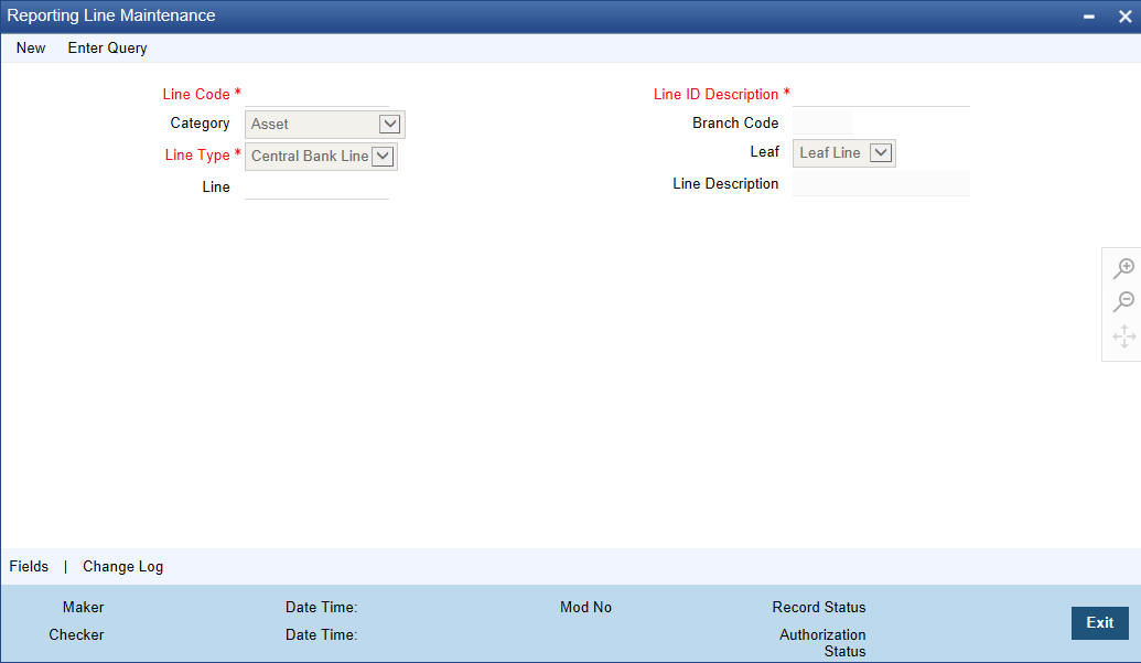 In the Reporting Line Maintenance screen, you can define reporting lines (heads of financial information) and indicate an alternate reporting structure for your Head Office and Central Bank.