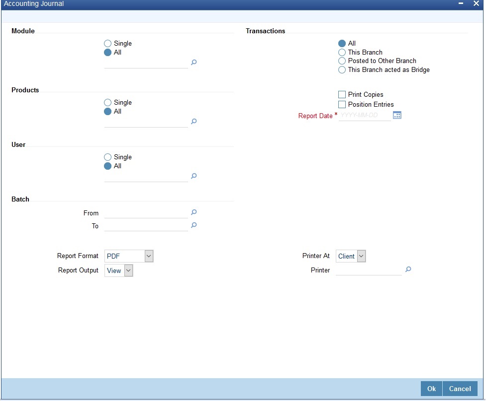 The accounting journal can be generated at any time during the day. Ideally, after End of Transactions Input (EOTI), the user who made the inputs should take a print out of the transaction journal for the relevant transactions, put it along with the vouchers or tickets based on which the inputs were made, and hand them over to the authorizer. The authorizer can then check the entries passed for each transaction and then authorize the transaction. Oracle FLEXCUBE provides you with many options to enable you to generate the journal for specific entries.