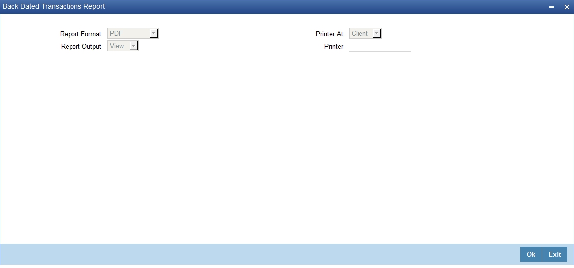 This report helps you analyse all the backdated transactions entered in the system. You generate this report using ‘Back Dated transaction Report’ screen. To invoke the screen, type ‘GLRPBDTN’ in the field at the top right corner of the Application tool bar and click the adjoining arrow button.