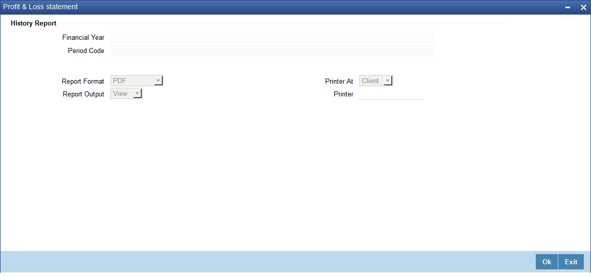 This report provides the details of profit and loss for a selected period. You generate this report using ‘Profit and Loss Statement’ screen. To invoke the screen, type ‘GLRPPLST’ in the field at the top right corner of the Application tool bar and click the adjoining arrow button.