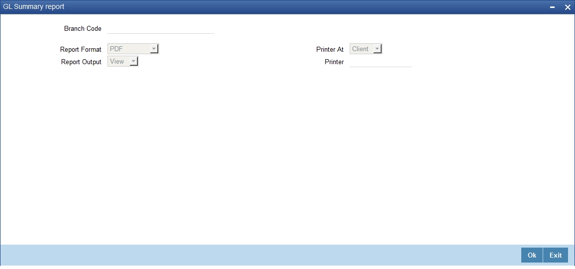 This report provides a summary of the general ledgers with details of debit and credit balances in local currency as well as foreign currency. You generate this report using ‘GL Summary Report’ screen. To invoke the screen, type ‘GLRSUREP’ in the field at the top right corner of the Application tool bar and click the adjoining arrow button.