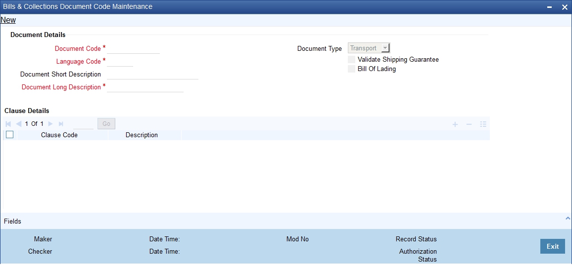 A clause is a statement that can accompany a document sent under a bill. Instead of specifying the details of a clause each time you need to use it, you can maintain a list of the standard clauses, which can accompany the documents sent under a bill, in the ‘Bills and Collections Document Code Maintenance’ screen.