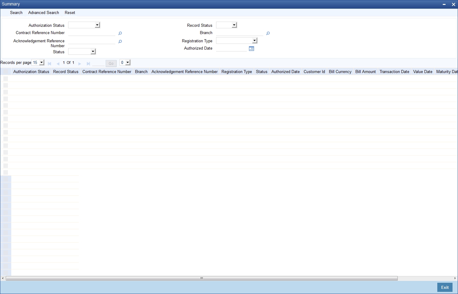 If you are calling a bill that has already been registered, click on Summary. The details of the bill that you have registered will be displayed in a tabular form. From the summary screen, you can open an existing registered bill by double clicking the reference number of the bill.