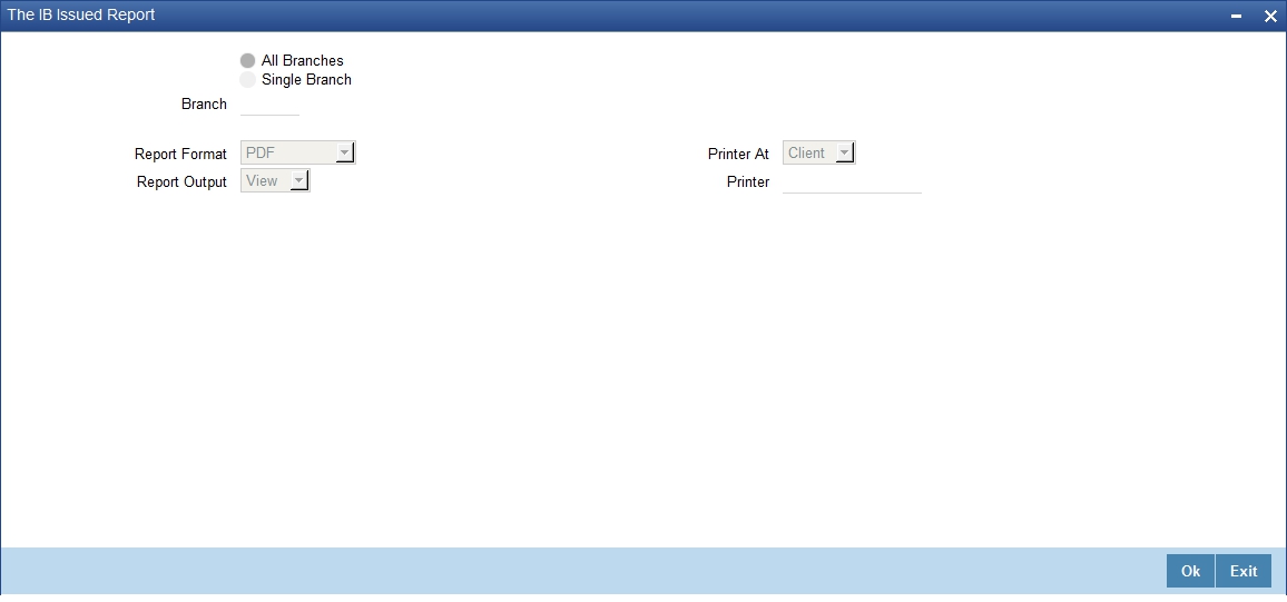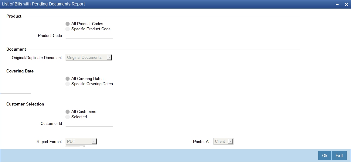 If you choose ‘Selected’, you need to specify the customer Id for which the report needs to be generated. The option list provided displays all valid customer Ids are maintained in the system. You can select the appropriate one.