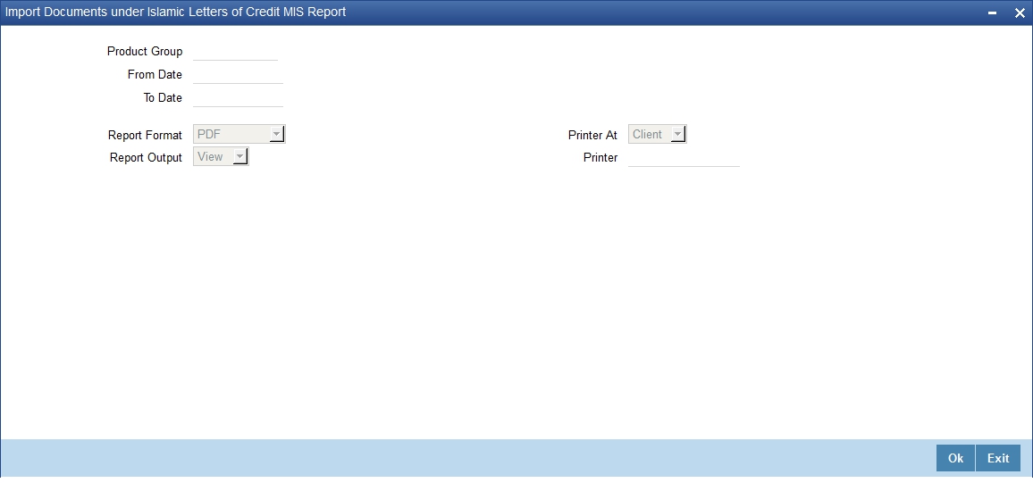 The Import Documents under Islamic Letters of Credit MIS report prints details of the documents imported under Islamic LC MIS. You can invoke the screen by typing ‘IBRPIDLC’ in the field at the top right corner of the Application tool bar and click on the adjoining arrow button.