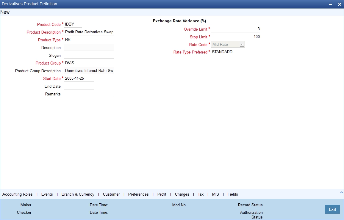 For any product you create in Oracle FLEXCUBE, you can define generic attributes, such as branch, currency, and customer restrictions, profit details, tax details, etc., by clicking on the appropriate icon in the horizontal array of icons in this screen. For a derivative product, in addition to these generic attributes, you can specifically define other attributes. These attributes are discussed in detail in this chapter.