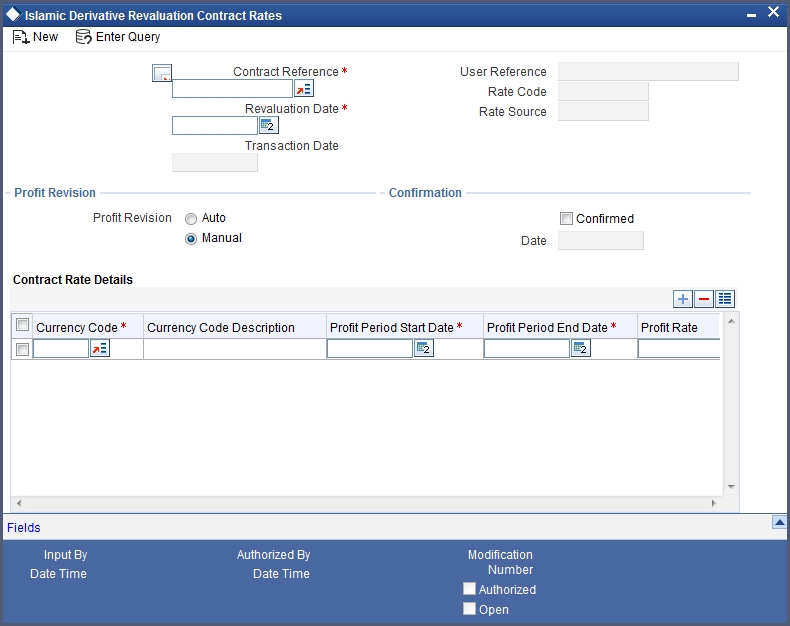For an ad hoc revaluation of a particular contract, choose New from the Actions Menu or click ‘New’ icon from the toolbar. The ‘Contract Profit Rates Maintenance’ screen will be displayed without any details. Select the reference number of the contract which is to be revalued after you indicate the new revaluation date of the contract you can specify the new profit rate for the profit period.