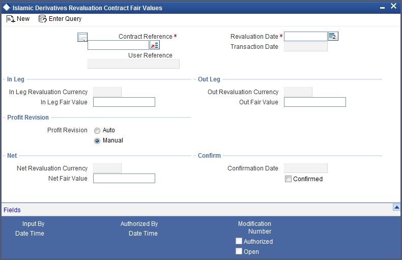 When you want to change the revaluation frequency of a specific contract, choose New from the Actions Menu or click ‘New’ icon from the toolbar. The ‘Islamic Derivatives Revaluation Contract Fair Value’ screen will be displayed without any details. Select the reference number of contract whose revaluation frequency is to be changed. Enter the revaluation date, the new in and out leg values and the net fair value.