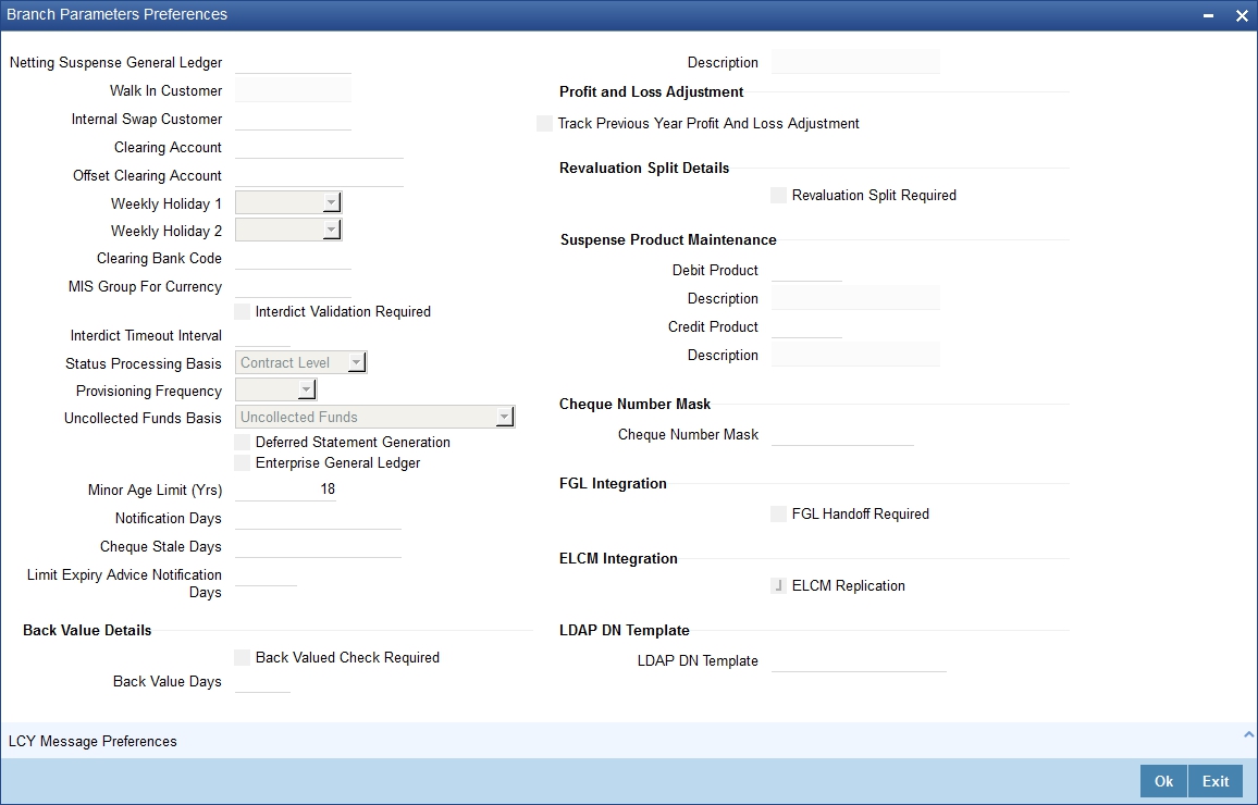 To enable data transfer between Oracle FLEXCUBE and Oracle FLEXCUBE General Ledger, you need to set certain options at bank parameter level. To invoke the screen, type ‘STDBRANC’ in the field at the top right corner of the application toolbar and click the adjoining arrow button. The system displays the ‘Branch Parameter Maintenance’ screen. Click ‘Preferences’ button on the screen.