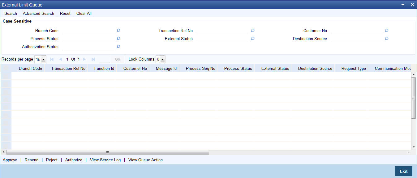 You can query and perform manual actions on external limit requests using Limit Processing Queue screen. This screen supports user action only on timed out requests. You can invoke this screen by typing ‘SQSEXLMT’ in the top right corner of the Application toolbar and clicking the adjoining arrow button.