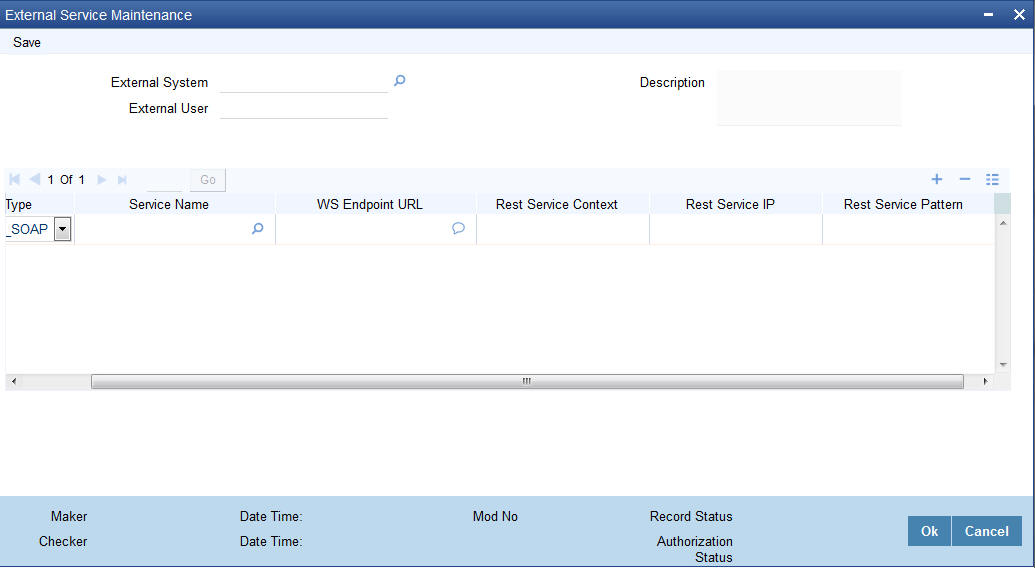 You can maintain external services using ‘External Service Maintenance’ screen. You can invoke this screen by typing ‘IFDEXSER’ in the top right corner of the Application toolbar and clicking the adjoining arrow button.
