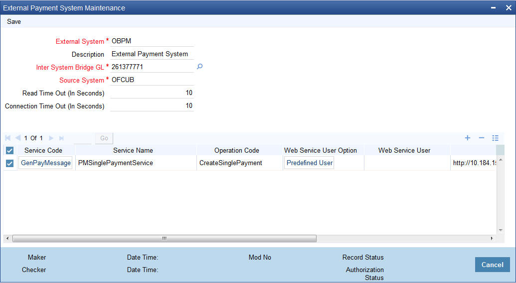 Oracle FLEXCUBE supports integration with Oracle Banking Payments (OBPM) for outgoing payments and message generation. You have to maintain the following details in FCUBS for integrating with OBPM for outgoing payments and message generation: