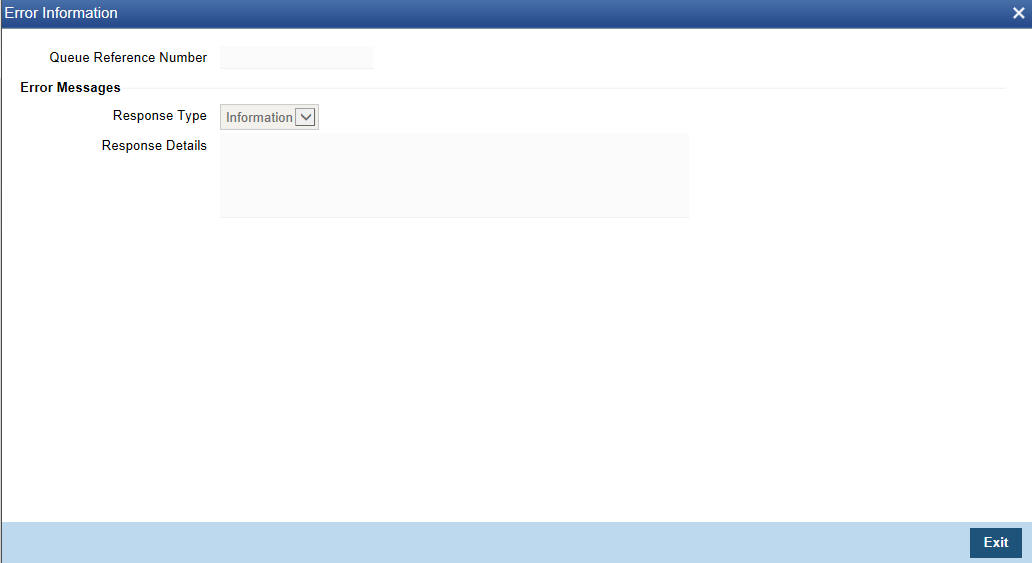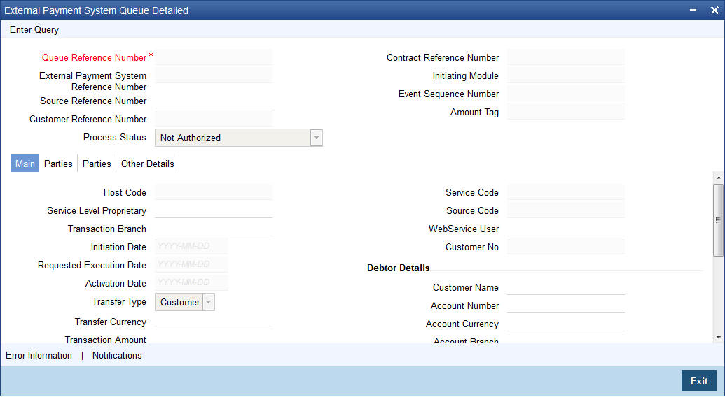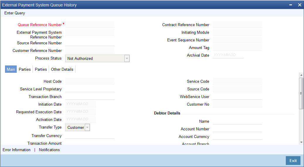 Specify the queue reference number and click ‘Execute Query’ to view the details of payment request sent to external payment system.