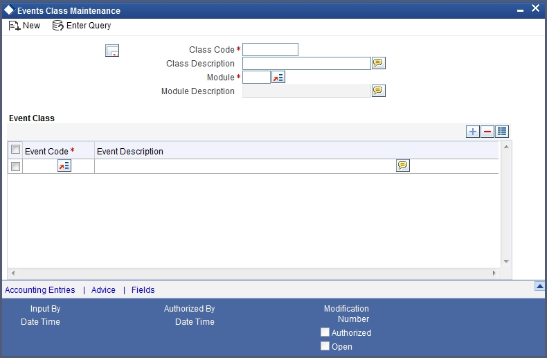 The events that you would like to include in an Events Class can be identified through the ‘Events Accounting Entries and Advices Class Maintenance’ screen. This screen is invoked from the Application Browser.