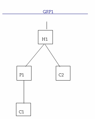 The following steps explain how to close an account in a given account structure. Let us assume that, in the structure shown below, we need to close account P2 and attach account C2 directly to H1.