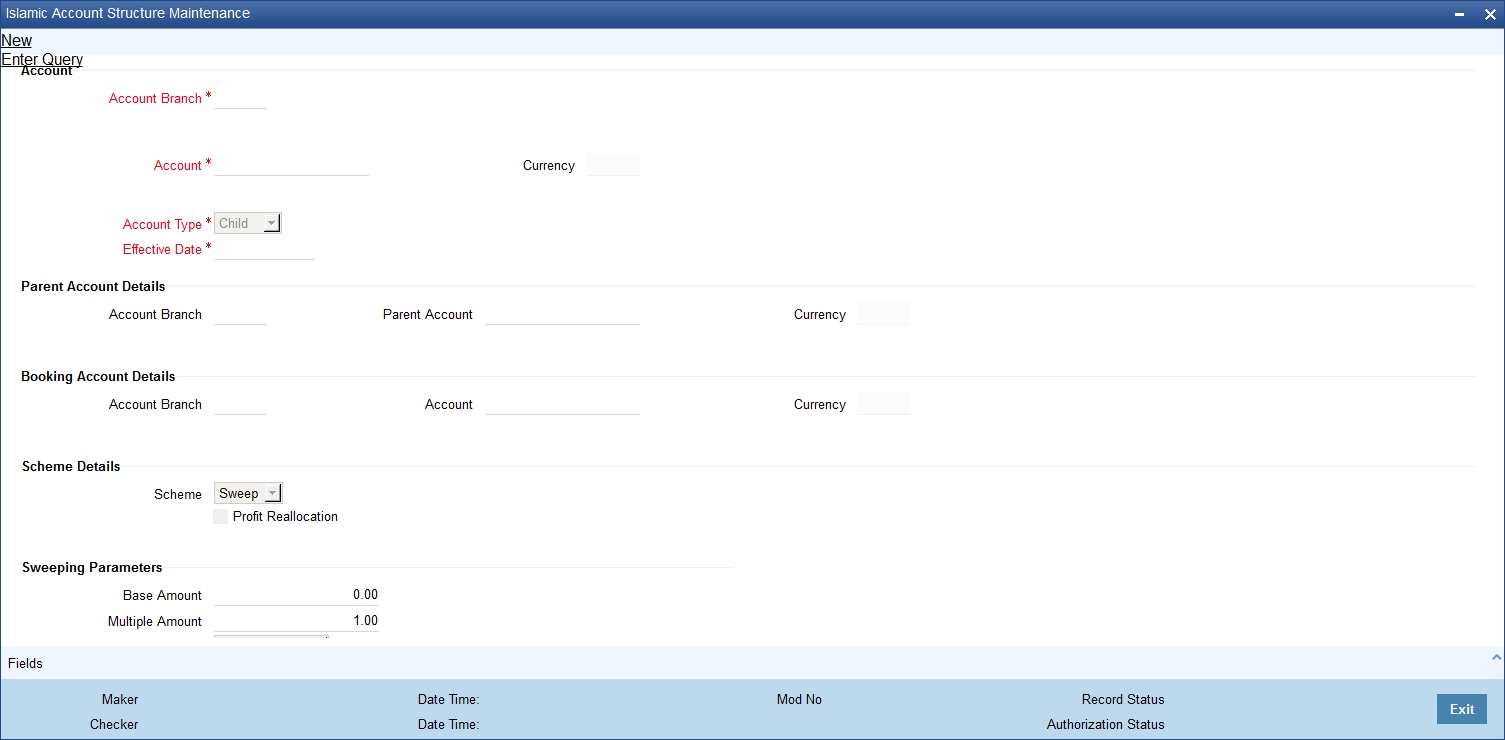 You need to define the account structure and the hierarchy for ILM processing in the ‘Islamic Account Structure’ screen. You can invoke the ‘Account Structure Maintenance’ screen by typing ‘IIDSWEEP’ in the field at the top right corner of the Application tool bar and clicking on the adjoining arrow button.