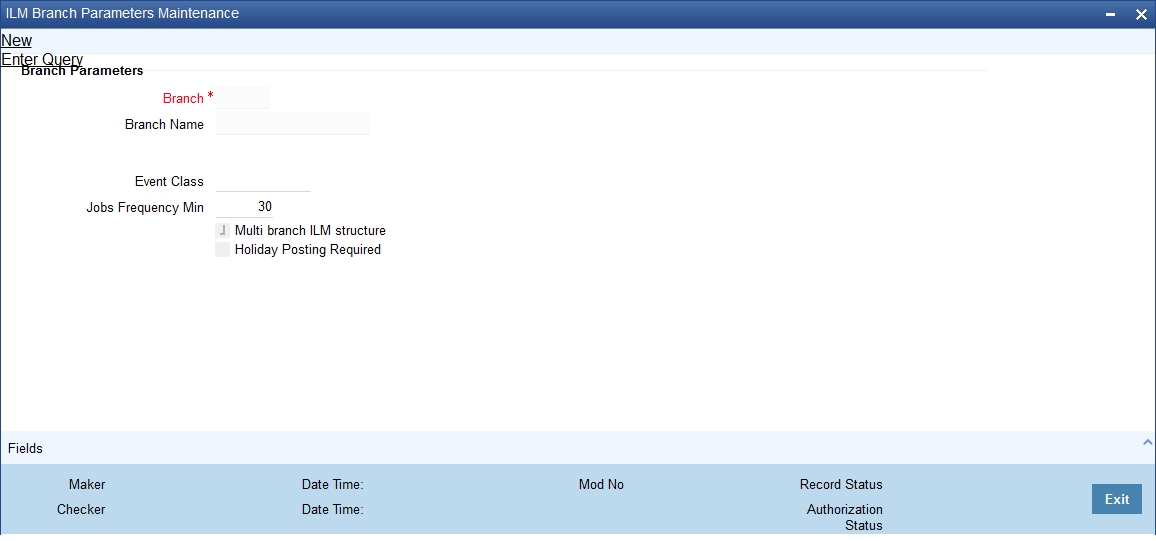 You can invoke the ‘ILM Branch Parameter Maintenance’ screen by typing ‘ILDBRPRM’ in the field at the top right corner of the Application tool bar and clicking on the adjoining arrow button.