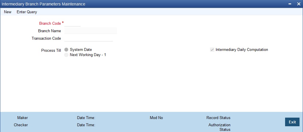 You can maintain branch-level parameters for all transaction involving the intermediary module, using the ‘Intermediary Branch Parameters Maintenance’ screen. You can invoke this screen by typing ‘INDBRMNT’ in the field at the top right corner of the Application tool bar and clicking the adjoining arrow button.