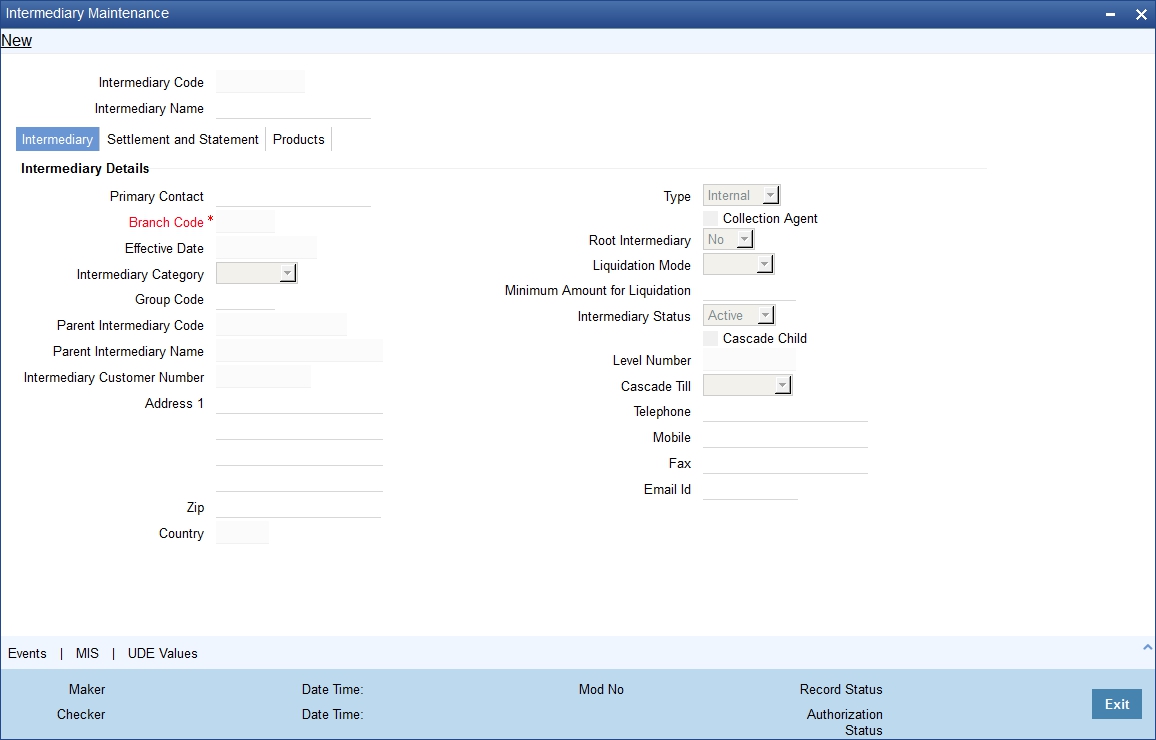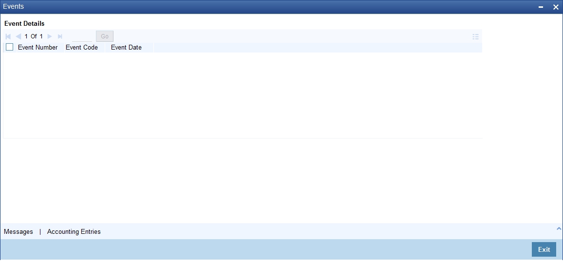 Click ‘Events’ button in the ‘Intermediary Maintenance’ screen and invoke the ‘Events’ screen.