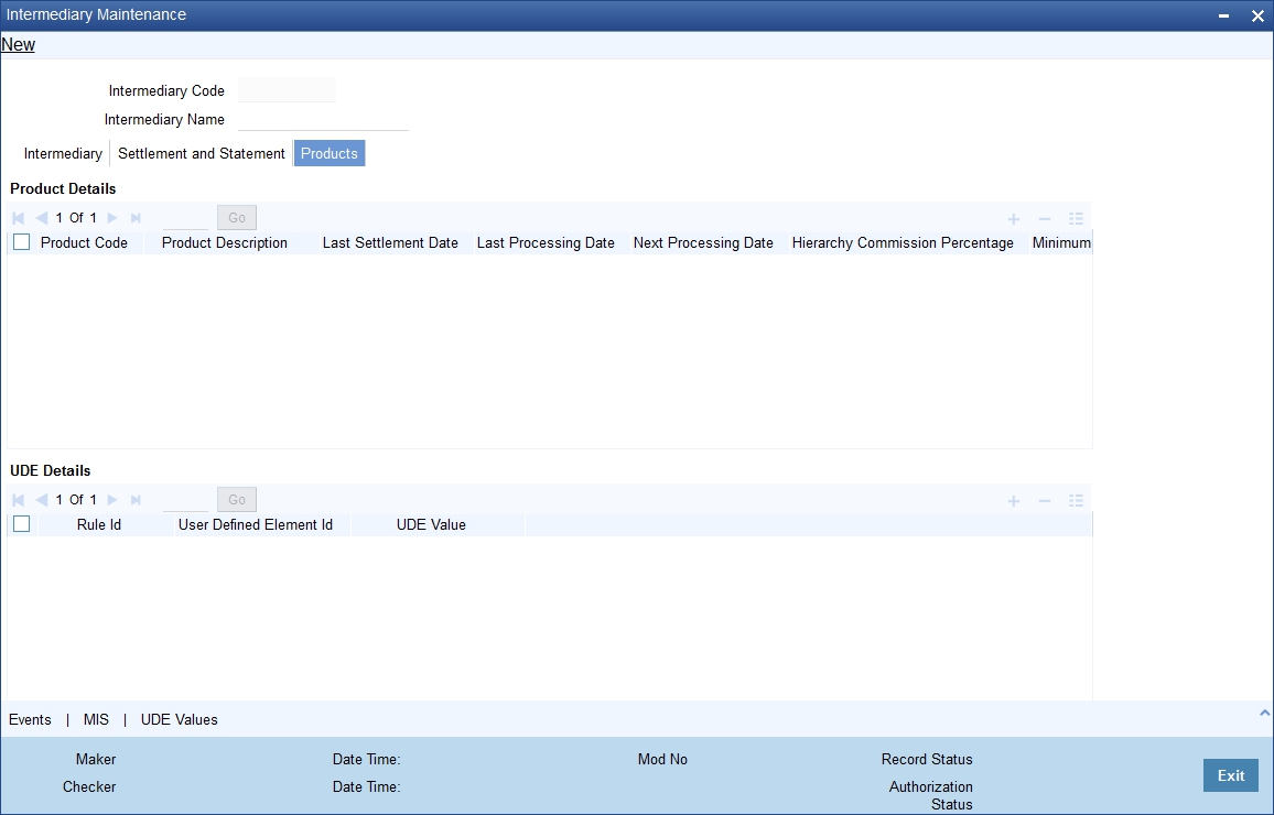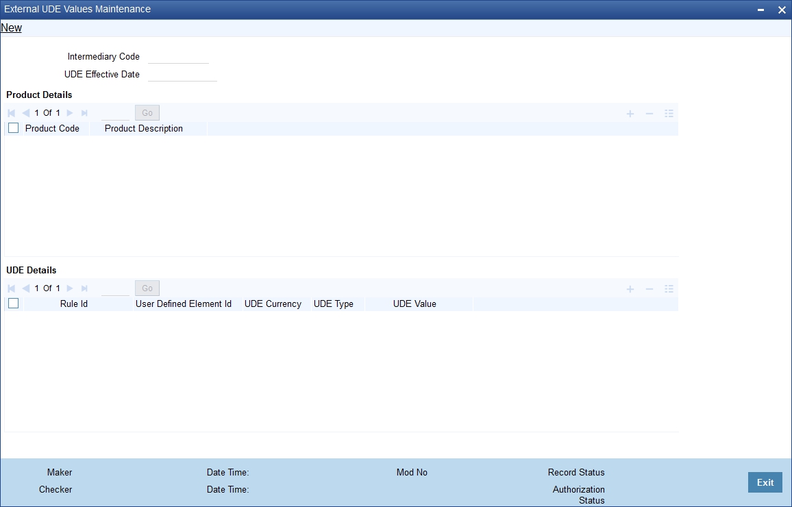 You may need to capture data from external systems for computation of intermediary commission. You can capture such data in the ‘External UDE Values Maintenance’ screen. You can invoke this screen by typing ‘INDUDEMT’ in the field at the top right corner of the Application tool bar and clicking the adjoining arrow button.I